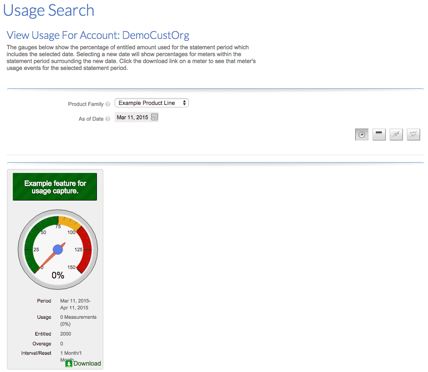 The captured usage information is then rendered on the Usage Search page. By default, the usage information is displayed as a gauge showing the percentage of the usage count compared to the entitled count. The label for the gauge shows the text you entered for the feature description, if any. The value you entered for Units on the Create a Feature page—in this case, Measurements—appears as the label for the usage count. In practice, this might be Downloads or Gigabytes or whatever usage you are tracking.